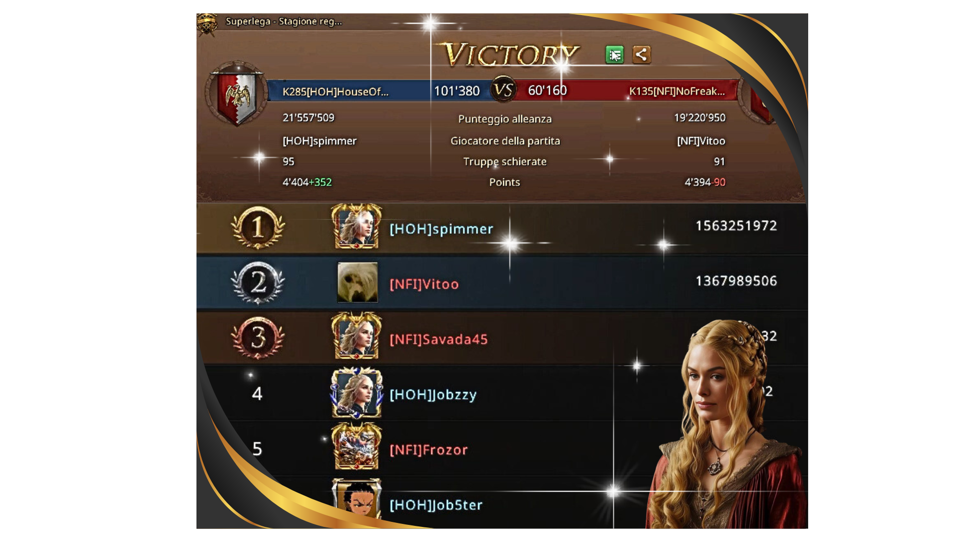 The NFI alliance, led by the charismatic Dreamon, a skilled and shrewd leader capable of inspiring his allies to fight with courage, supported by incredible warriors in terms of skill and experience such as Wallace 1st and Missim, was a high-level group. The prediction slightly favored HOH, but it was a match that promised to be a true battle. In response to the 95 members deployed by Grombold's faction, the opponents appeared with 91 members, a minimal disadvantage.