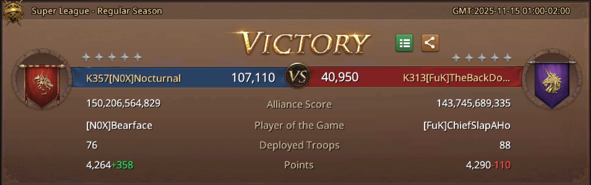 By the time our N0X team stepped foot onto today’s battlefield, we were already victorious in many ways. A grueling regular season had pushed us to our limits, which turned out to be exactly what we needed to be able to reach new highs as an alliance. In the 6th match we made one final desperate push to make it into the Ultimate Conquest season, by fighting FuK at a wildly irregular hour, with attendance numbers down and knowing that we couldn’t spare a single misstep. But that turned into a victory that left us sitting right at the coveted rank 16 spot, meaning we had clawed our way into the playoffs. It was a spot that felt earned, as our leadership, strategy, and team execution had finally snapped into alignment at exactly the right moment.