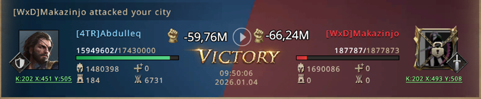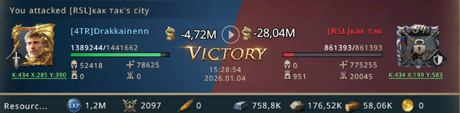 Victory! Even though this was a training KvK where the entire army returns, the opponent chickened out. Only the guy from out of this server showed how to fight. It turned out to be a rather one-sided KvK.