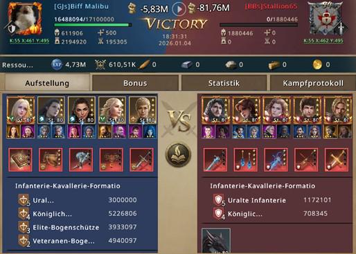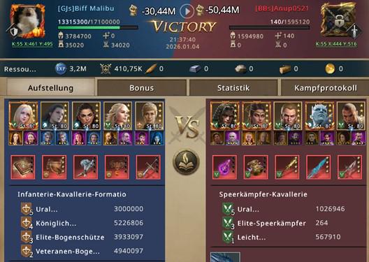 Stallion65 came with a strong Infantry lineup using bleed synergy but had no chance against Biff`s female setup and the 17.1M bowmen.