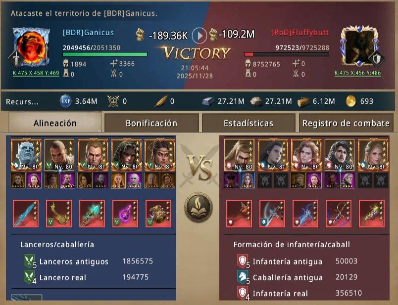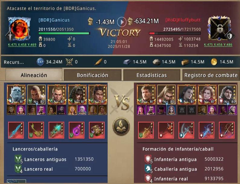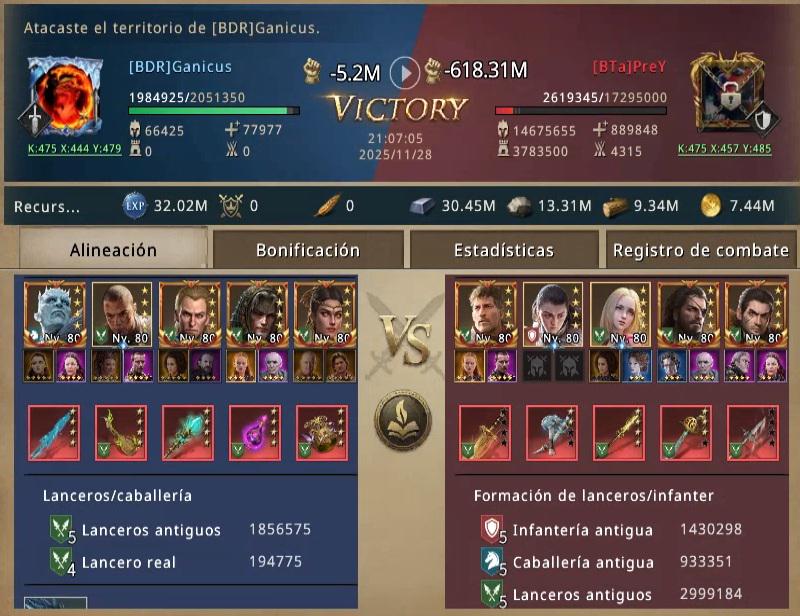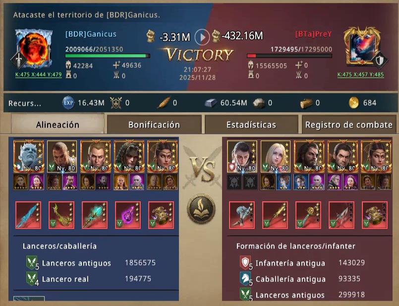 Ganicus, despite the uncertainty and fear that the targets would be placed in a bubble, attacked with the same configuration as in the first target, and this time did not suffer significant losses as PREY defended with spearmen, However, this was not enough to defend itself, as it lacked statistics and was equipped with expeditionary gear, losing a total of 14.6 million troops in that attack.