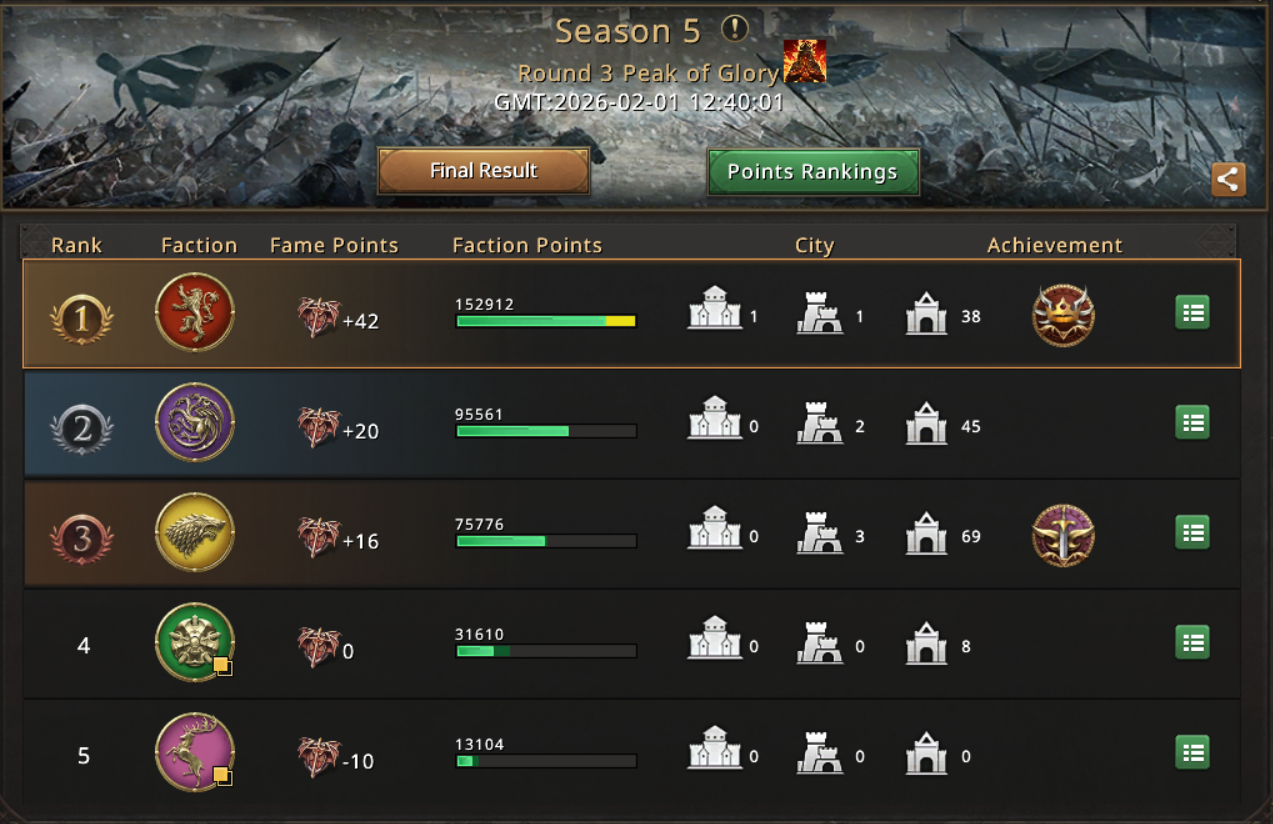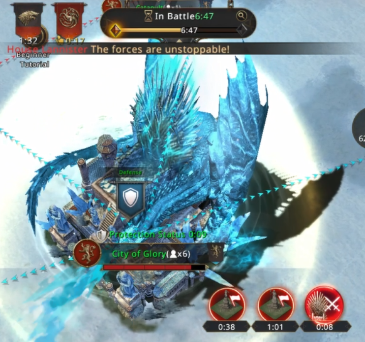 But then with 10 minutes left till the end of the round, a miracle happened on the battlefield, the reinforcements came in time after each rally and the House Lannister managed to occupy the City of Glory. Raising the Lannister's flag above the city basically signaled the end of the fight, as there was not enough time left for the other houses to fully occupy the city.
