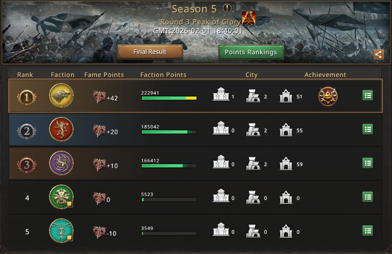 And then the defense resumed and the back and forward battle continued for most of the fight left with Starks gaining terrain every time they were able to get the City of Glory. Ultimately, after millions and millions of troops died, the other 2 houses had to stop rallying as their medics didn't manage to keep up with the loses, they were taking on the battlefield and with 5 minutes before the end of the fight, the Starks managed to claim the ownership of City of Glory.
