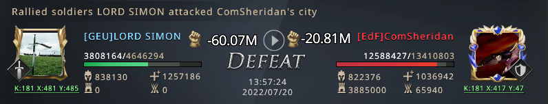 This rally did not go as well as the first for GEU and Lord Simon. The defense of EdF ComSheridan proved to be too much and Simon and Geu suffered a loss. The numbers are not horrible but it can safely be assumed that EdF ComSheridan lost mostly T1 troops while GEU lost T3-4 troops.