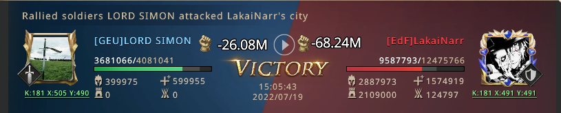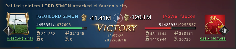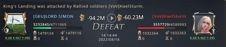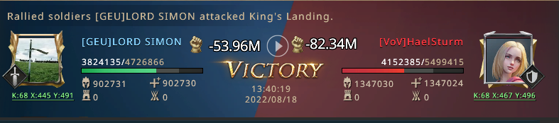 This rally is a thing of beauty. voV el faucon lost nearly 5 million troops and over 120 mil in power while GEU lost only 220k troops (you know they were T3). Very nice. But VoV Haelstrum hasn't given up on King's Landing and he rallies a fresh GEU garrison at King's Landing.
