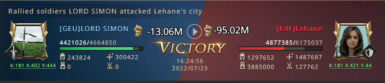 Aaaah, this was a great rally for the GEU squad who suffer less than a quarter million troops lost but kill off over 1.2 million troops from the castle of EdF Lehane. Very nice!