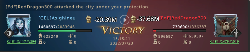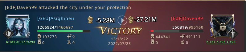 It was a gang rush attack against GEU Asighineu! But her defense holds up against EdF Daven99's attack. Daven lost his commander and nearly half a million troops while Asighineu lost 200k troops. EdF had the right idea and I give them credit for trying. A few changes to their setups and maybe another attacker and Ashighineu could have suffered heavy losses. But but but it didn't happen that way.