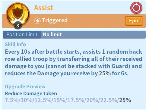 This Assist skill is useful for reducing the damage received by Richard I while reducing the damage received by the back row Immortals so that they can produce more damage. Damage reduced up to 25% at level 8.
