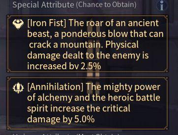 Special attributes that may be obtained by using this artifact are Iron Fist and Annihilation. Iron Fist functions to increase Genghis Khan's overall damage. Meanwhile, Annihilation only adds the critical damage dealt by Genghis Khan. I personally prefer Iron Fist for status usage in The Great Code of Genghis Khan. This is because Immortal Genghis Khan rarely takes critical damage (rare doesn't mean never).