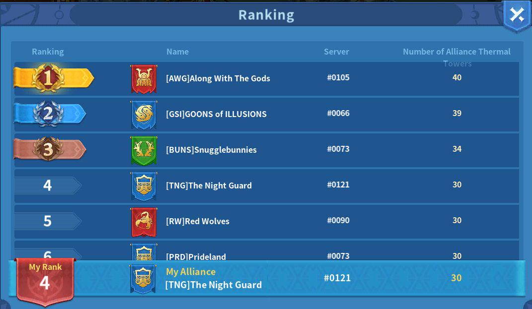 The most active server with tower construction is server #0105 with the name AWG or Along With The Gods with a total of 40 towers. Meanwhile, in positions 4-6 with a balanced number of towers, namely 30, each alliance consists of servers #0121, #0090, and #0073.