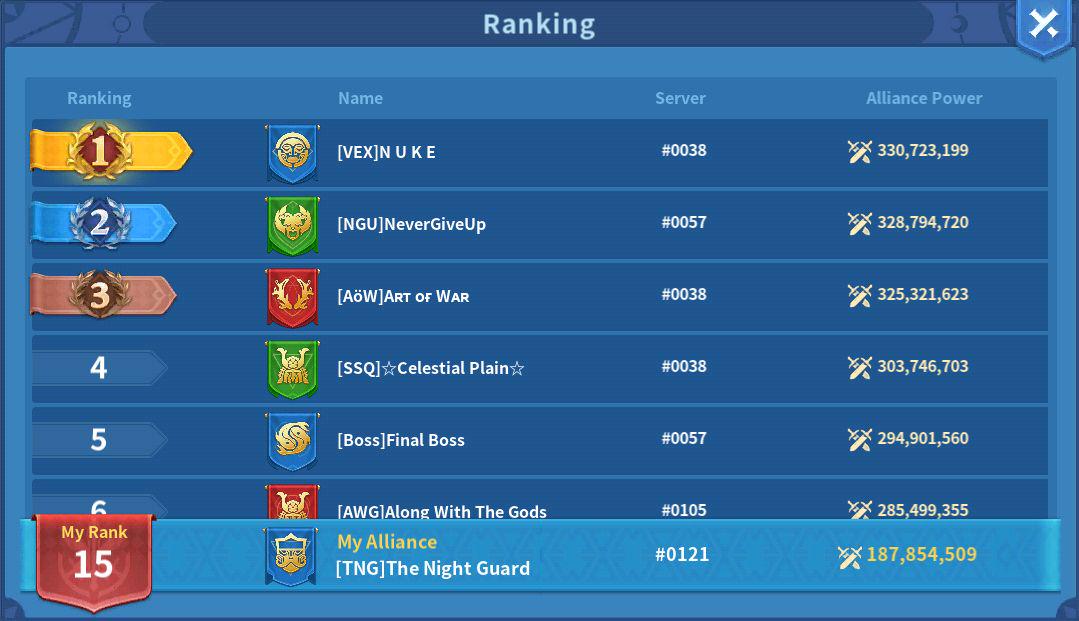 We see that server #0038 is ranked 1st with the highest power alliance with the number of 330 million as VEX and server 57 with the Boss alliance is ranked 5th with the total power alliance 294 million.