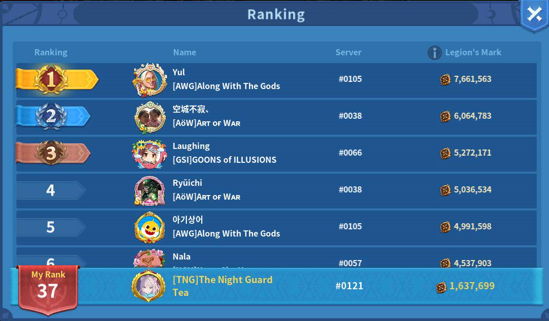 Server 105 has the highest Legion Marks of over 7,000,000 which means this server is active and has a fairly large and strong farm.