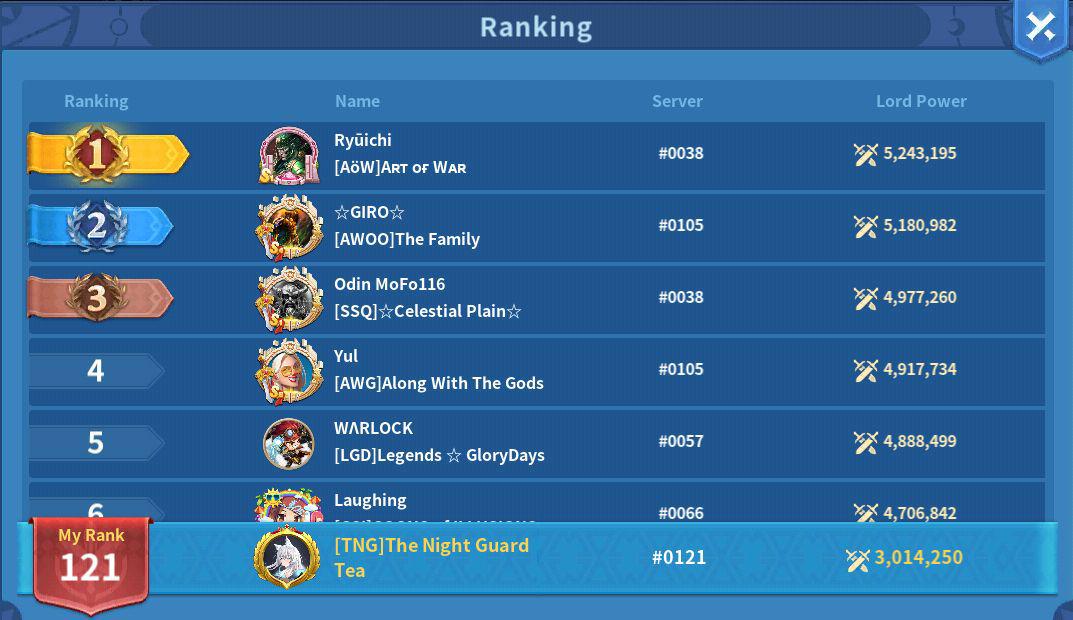 The highest Lord Power is Server #0038 with a total Lord Power of over 5 million. By comparison, the Lord Power that I have, which is in the range of 3 million, is in position 121.