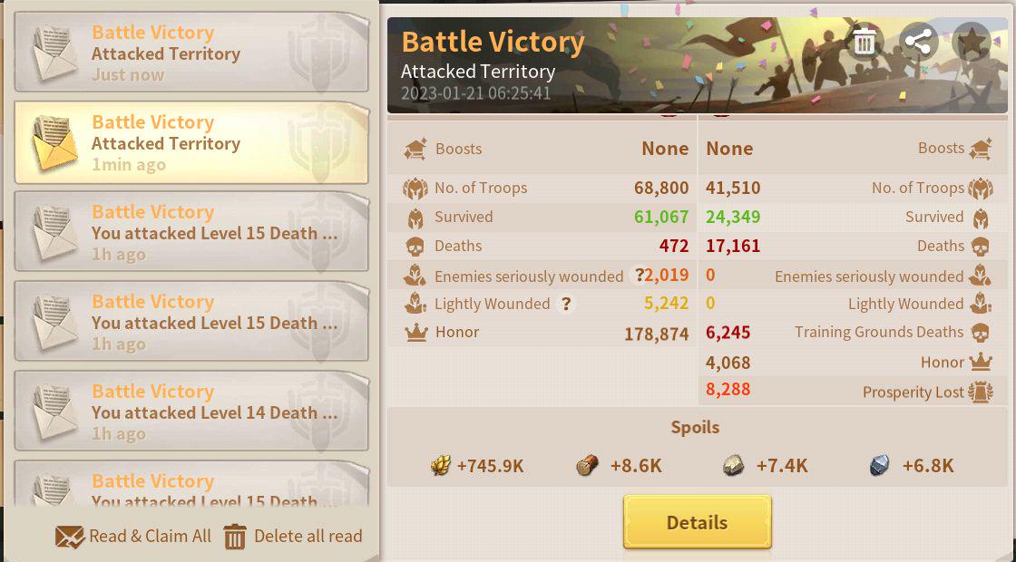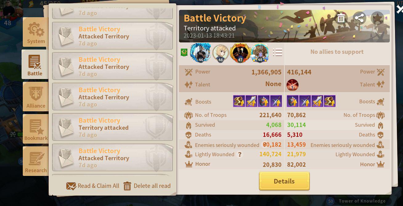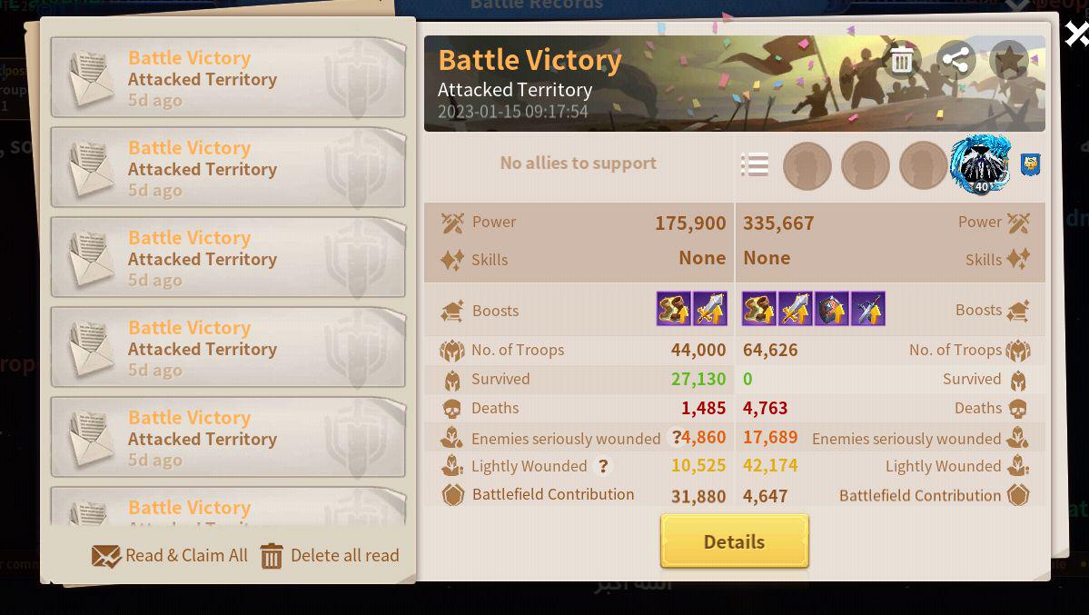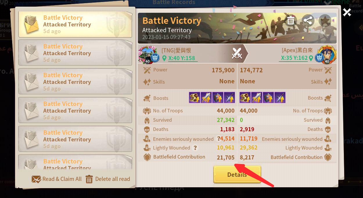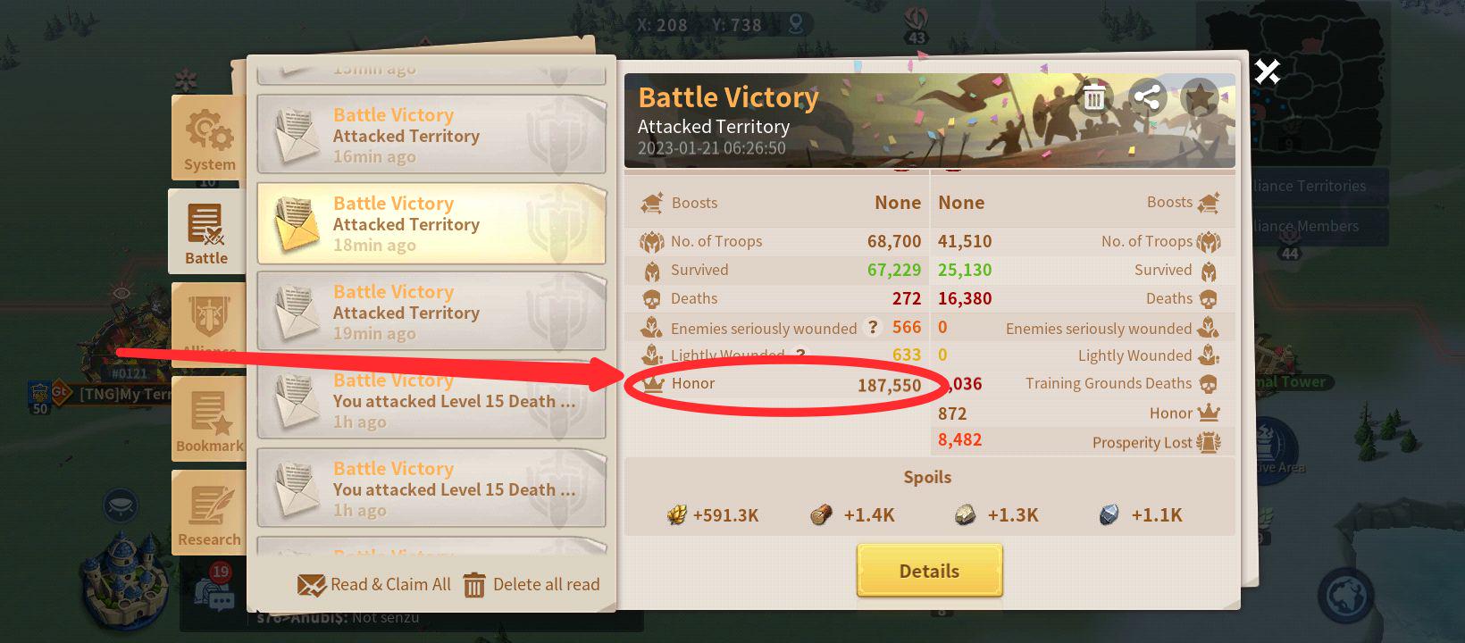 The picture above is PVP activity on the Legion of Frostborne map against BUNS server 73. We can see that the Honor obtained is quite a lot even though the number of troops that died from the attacking team is relatively small, this is because there is a 3% Honor Nobility bonus. To clarify further, several reports will be attached in the Illusion Battlefield where you can get Honor more easily by using the Bon Voyage Decoration Castle!