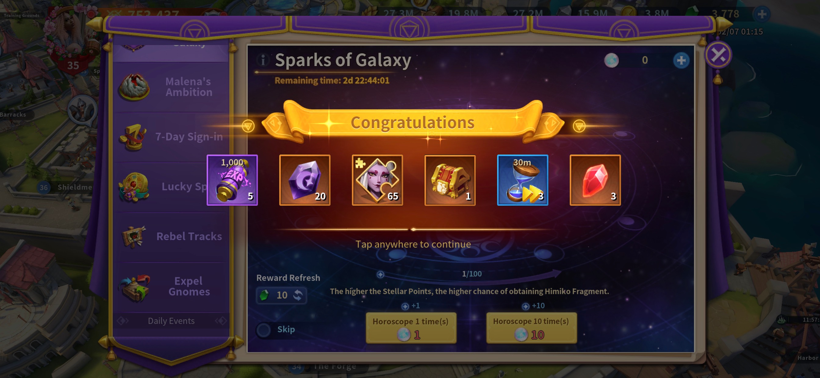 In total I got 85 himiko fragments I spent approximately 3k gems on sparks of galaxy if I had more gems I would have gotten himiko to 2 stars 🥺but am f2p as you all know. himiko is generally more expensive, compared to Richard,Baldwin and genghis khan but here in this event she is served in a cheap platter to us all