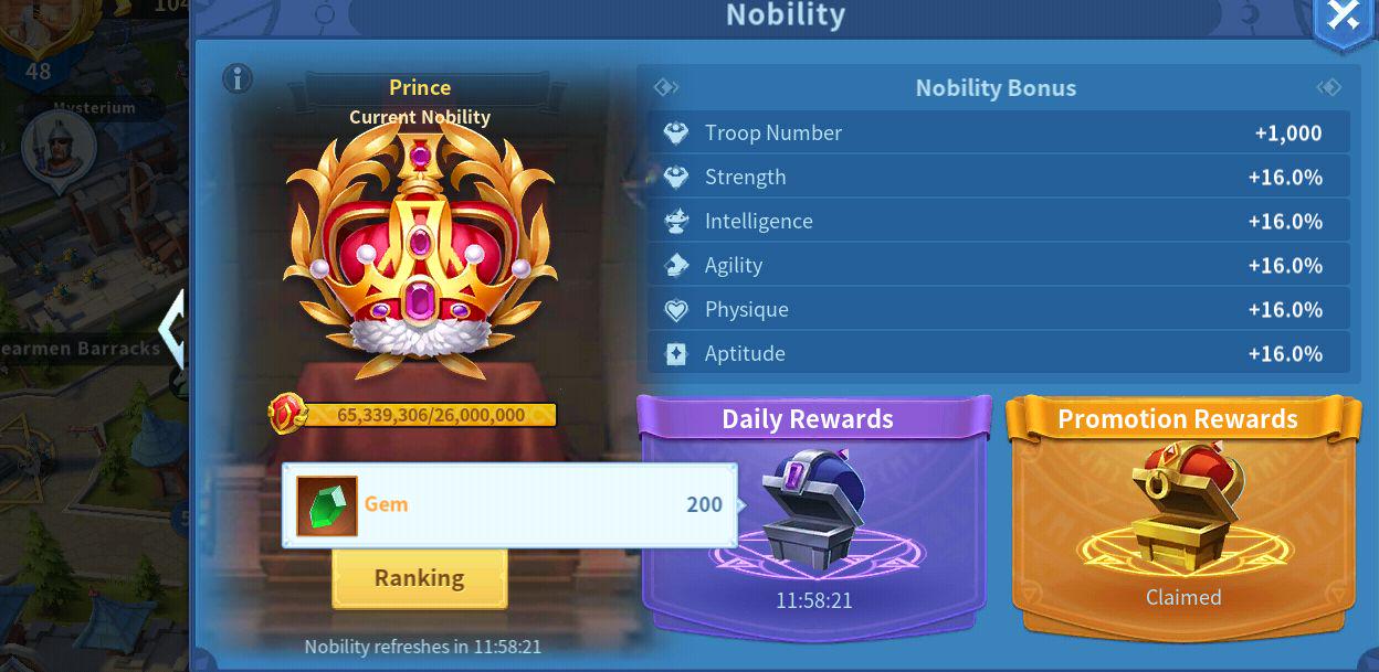 Did you know that Honor Nobility will give you daily Gems, the higher your Nobility the bigger the Gems you will get!!!