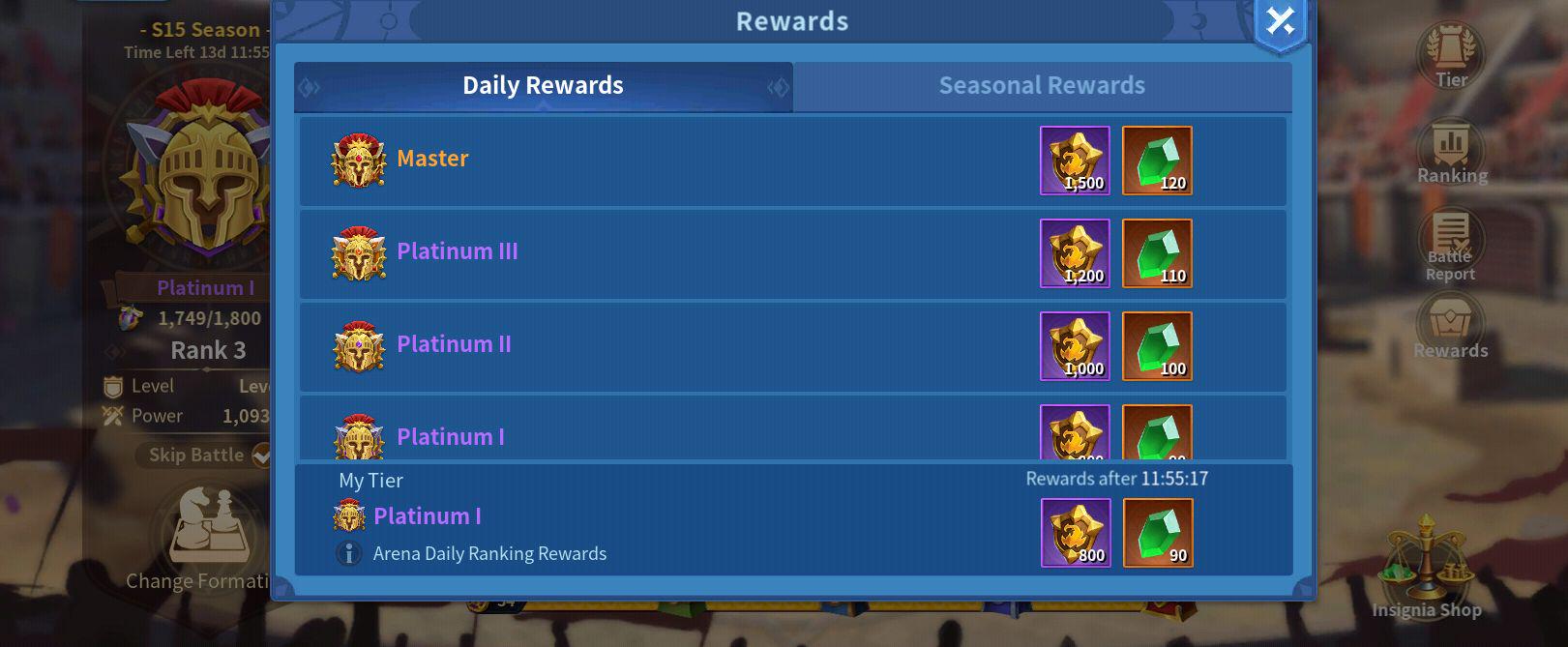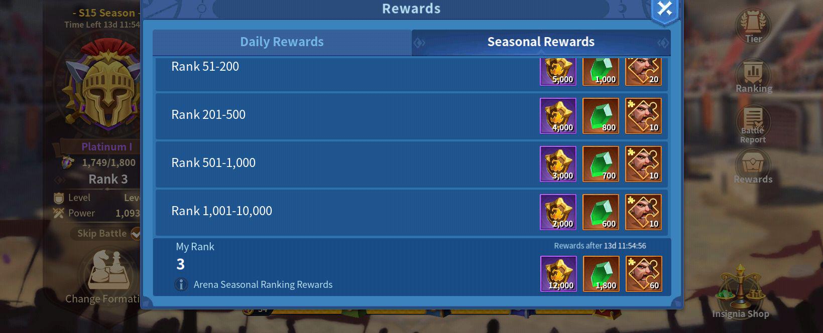In the Arena you can get daily prizes, and of course you need to log in every day to get these Gems. Apart from that, the Arena also offers seasonal prizes as shown below.