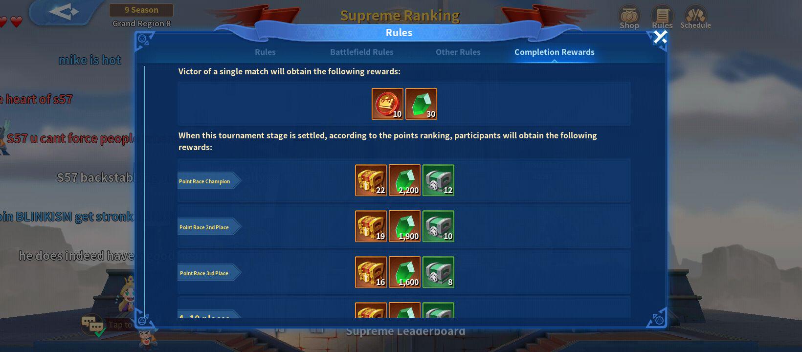 In the Throne of Supreme event, you can get quite a lot of Gems, starting from the Elimination Point, you can get Gems for every successful attack, besides that if you are on top in each round accross Server you will also get a lot of Gems!