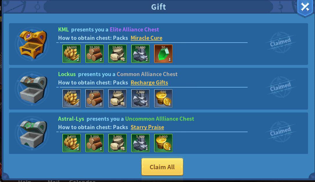 If you live with big whales, then you will always see lots of Gems present in your storage bag. This is because when they purchase a package, they automatically give additional gift boxes to other lords in the same Alliance.