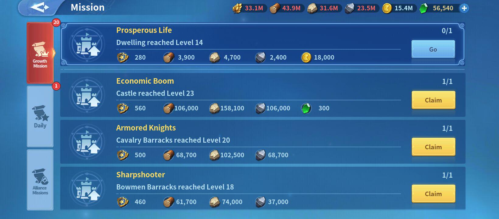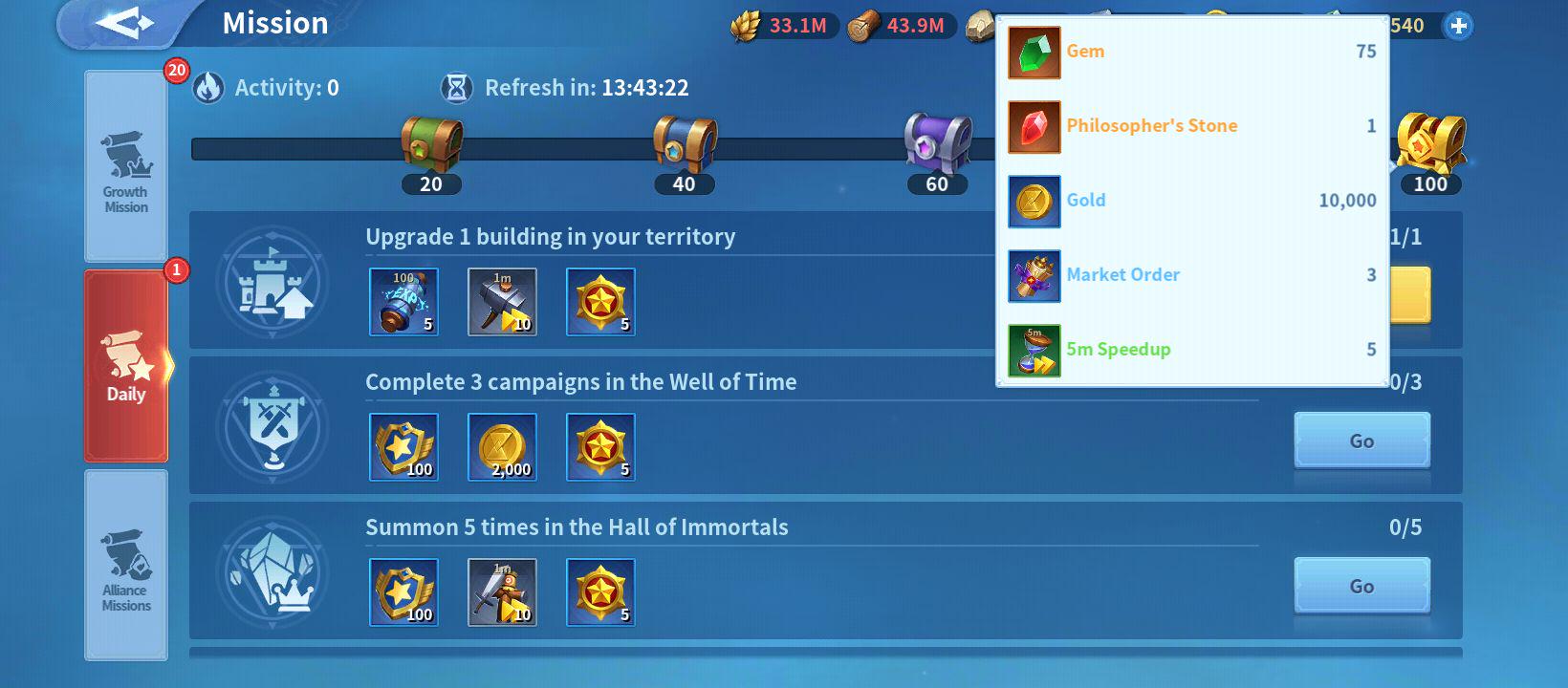 The Daily Mission will be approached in this first discussion. First we have to know about Daily Mission, everyday you can get 100 gems from daily mission after reached 100 point with following stage rewards: