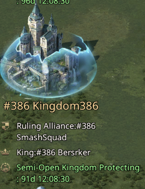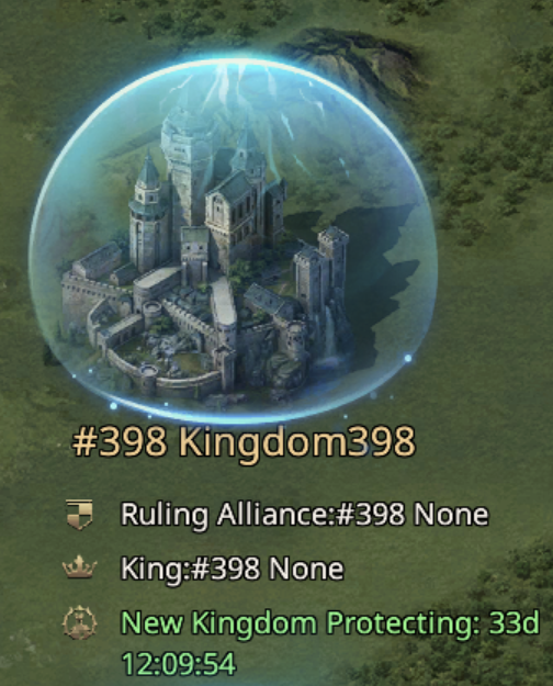 The bubble around the kingdom indicates they are protected. This protection lasts 40 days. What it does is it gives newer players time to develop without having to worry about Whales invading. In the picture above, we see Kingdom 398 they have just over 33 days of protection remaining. Only Characters on Kingdoms that come after (like 399) will be able to relocate to them while they are in the full bubble.