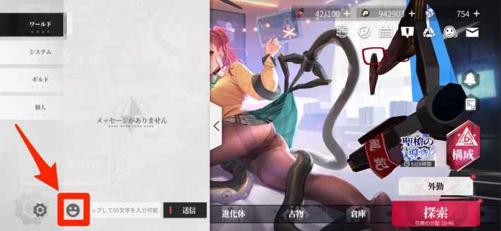 スタンプはワールドチャットやギルド、個人チャットにて送信できるスタンプ機能のこと。エモートも同じ意味だ。スタンプは、チャットの文字入力の左側にあるアイコンをタップすると使える。
