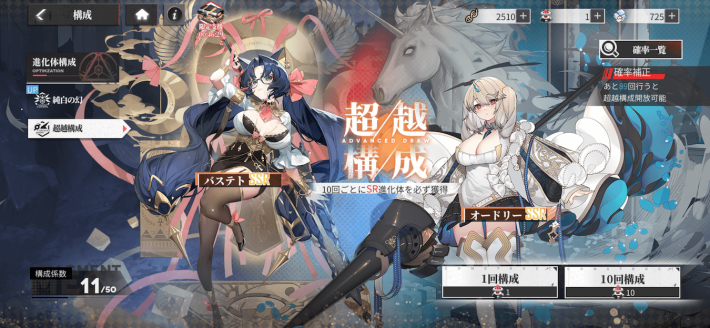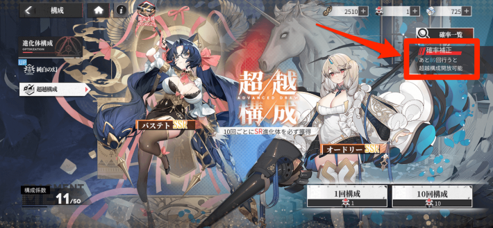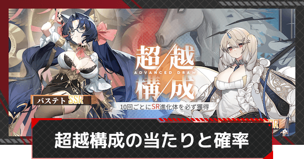 超越構成ガチャは、10連以内にSRキャラが1体以上確定で出現する。さらに、1連ごとに左下の「構成係数」が1溜まり、溜まっている数に応じてSSRキャラの出現確率がアップ。構成係数が50に達するとSSRキャラが確定で出現し、SSRキャラが出現すると0になる。