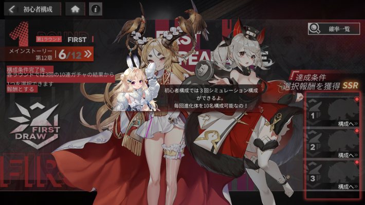 初心者構成ガチャでは、全3ラウンドでそれぞれ10連ガチャを3回引ける。ガチャを引いたら、3回の中から好きな結果を選んで受け取ることが可能だ。また、10連ごとにSSRキャラが1体確定で出現するが、2体以上は出現しない。