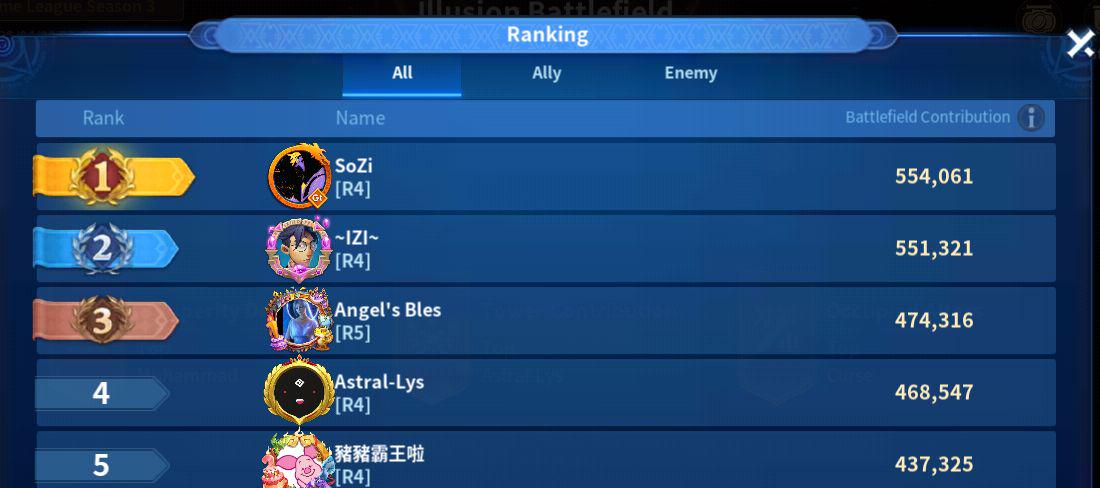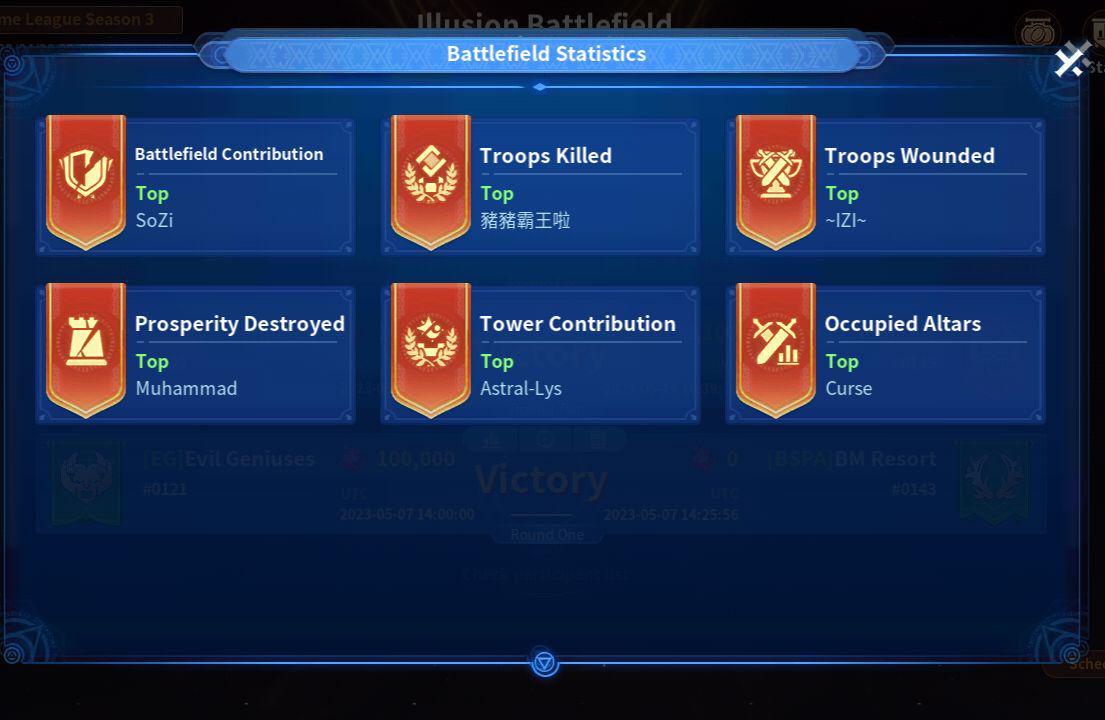 The definition of the Battlefield Contribution will be covered in this section. However, keep in mind that if you want to win in Illusion Battlefield Prime, this number must be greater than the average number of players with the same number of players. If scores fluctuate, for example, if one person's score doubles, this does not guarantee they will win because differences in scores between one player and the other players have a substantial impact on the outcome. On the May 28 2023 match played by SKYM from server 100 and EG from server 121 it was seen that [EG] SoZi was the best player in this division.