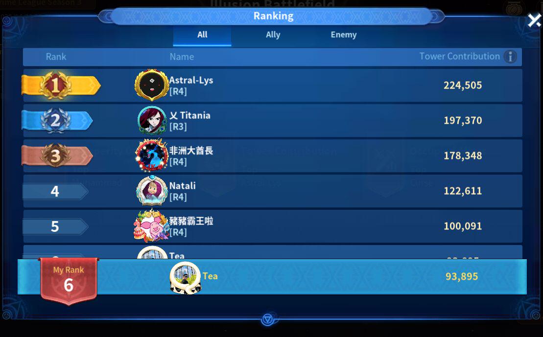 The definition of the Tower Contribution will be discussed in this section. Tower Contribution is the most important component in determining victory in Illusion Battlefield Prime. This is owing to the fact that you must earn as many Violet Points as possible within one hour, with a maximum capacity of 100,000. This should be the highlight for Illusion Battlefield Prime League competitors. The best slayer for this match is [EG] Astral-Lys from the server 121.
