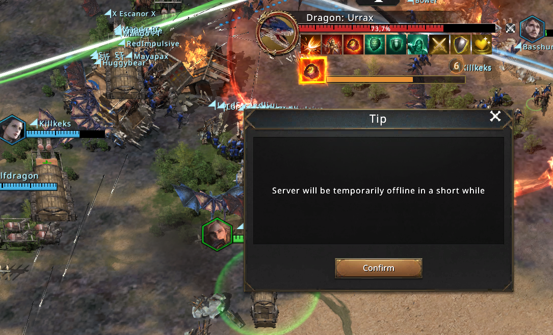 We were just attacking the dragon yesterday in the Domain when we was cut off . In the first place not all could join for a 400 Bad Request so we had to do with whom could enter what already is a disadvantage. Than we was winning against the dragon (my print is a bit later the dragon already gained life again) with around 20 min to go we was cut off for this emergency update. When we could get in again only a few minutes left the dragon gained all life again and a lot off carts was destroyed. The troops no matter here but you lose a bar on the cart! On top off this people got stuck behind the wall off the Domain unable to return their marches home.