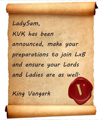 Looking over, LadySam replies “Yes, we have received word from King’s Landing; KVK has returned and preparations must be made. Get word to all the lords and ladies prepared; whether to fight or farm we need as much support as we can muster.”