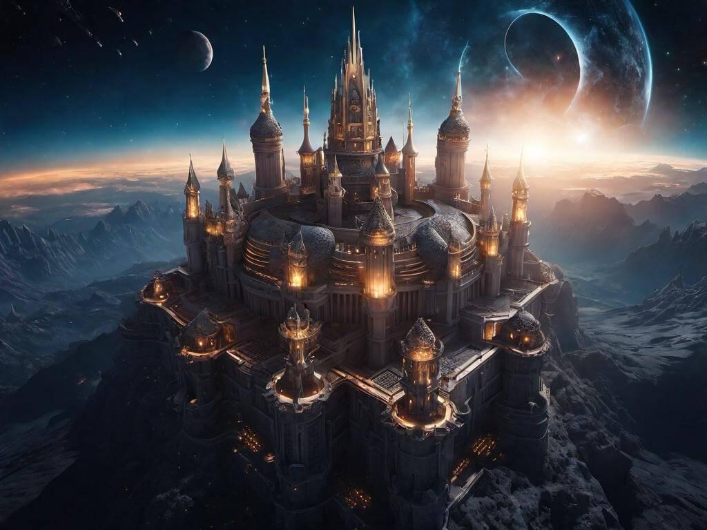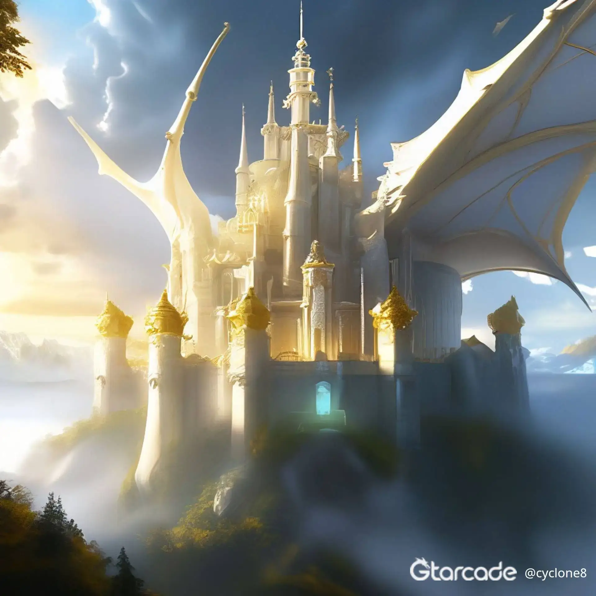 высоко детализированый сказочный замок ярко белого цвета окружён прочными золотыми стенами,множество построек и сторожевых башен на территории замка окутан туманом от замка исходит белое свечение сверкают молнии,над замком летает белый дракон