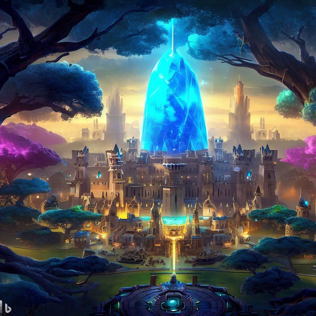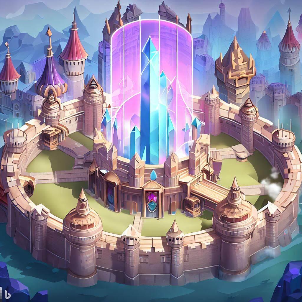 Concept: City were magic is possible using the endless supply of the crystal in the center of town. The town formed around this crystal, it was not transported here. All likes of scholars and mages come to study and use the crystal. A large wall with many towers was created the guard this treasure.