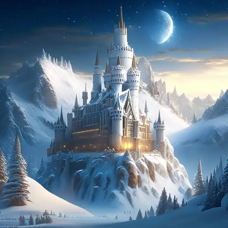 a highly detailed white castle with many buildings and towers is surrounded by white-gold walls against the background of snowy peaks emits a glow