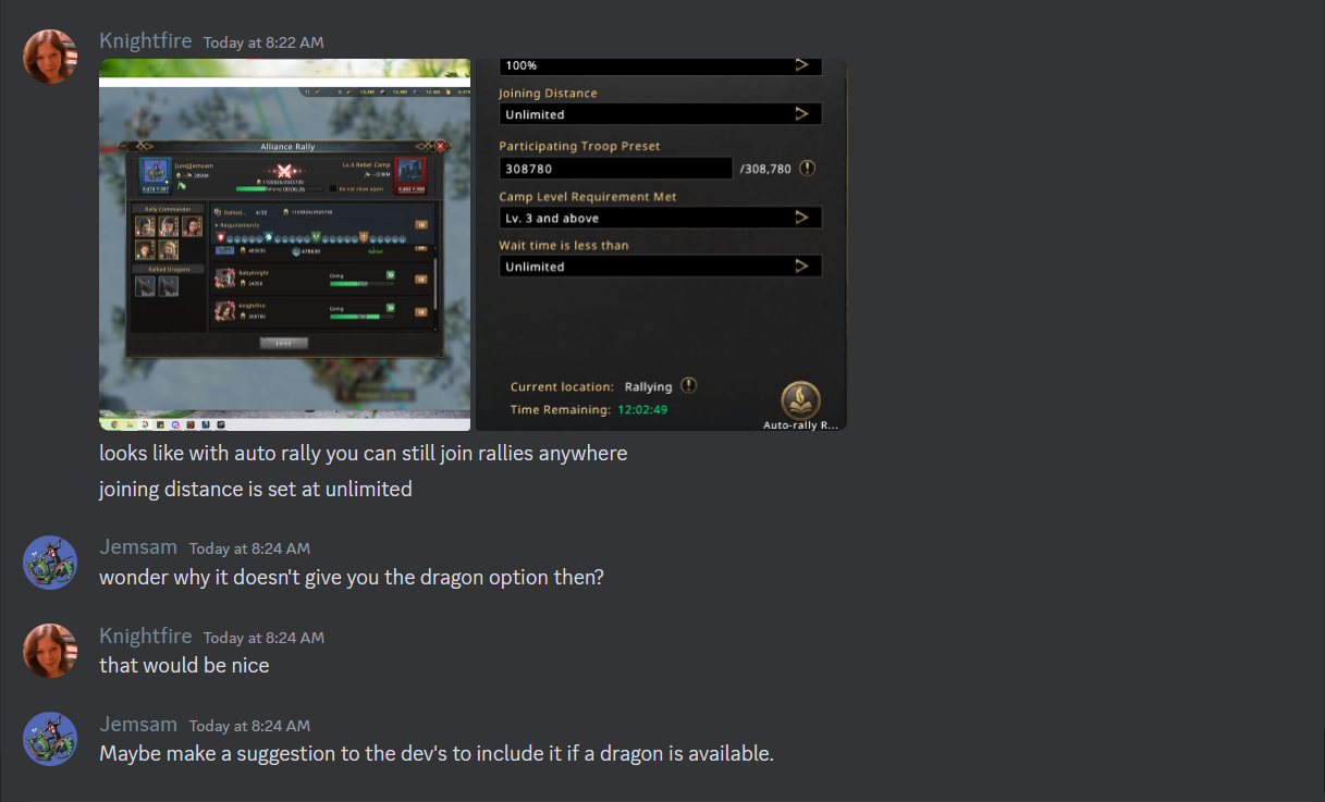 Seems odd to be able to join rallies from WF to RR with auto rally but not manually and no dragon. A little discussion on it. Think we could fix it to add dragons to auto rally