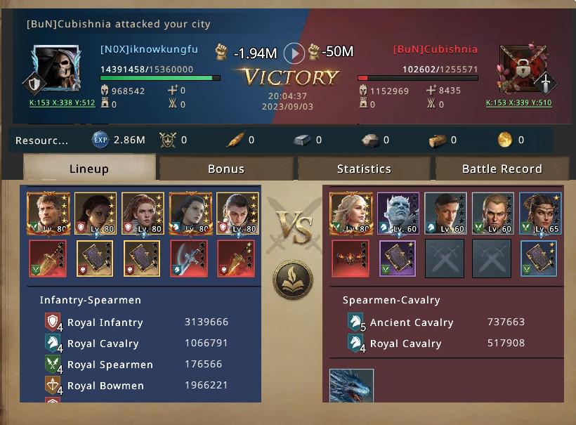This was the hit that, in my eyes at least, sealed the deal for our victory in N0X and for K385. Cubishina was a name I'd known for a while - she's a rally lead that had enjoyed stints in BDR, strong enough to even lead rallies in one of the most powerful alliances in the game - so she was always going to be a huge headache for us. Luckily for us, and bizarrely, she decided to leave all her game know how at the door as she came at us. As strong as her army is, sending a hodge podge of commanders with her poor horseman straight into KungFu's 15 million strong defense was... interesting, to say the least. The most powerful enemy player's lord sitting sad and dejected in one of our dusty dungeons and with K385 already enjoying a sizeable lead, things were definitely looking good!