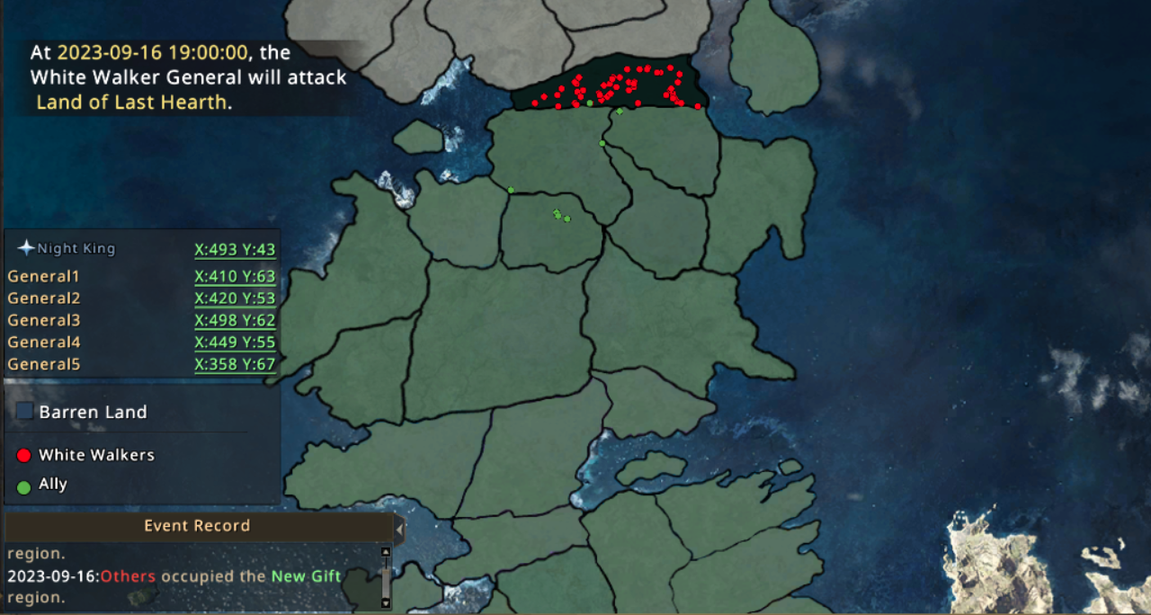 Day 3: After a successful charge on the Dreadfort Region, the White Walkers embarked on a frenzied raid on the Barren Hills, bringing the Night King's army closer to Winterfell. Jaime Lannister and his troops arrived in time to assist the commanders in Winterfell, providing Night's Watch with additional allies to defend Winterfell from falling into the hands of the Night King and his army of the undead.