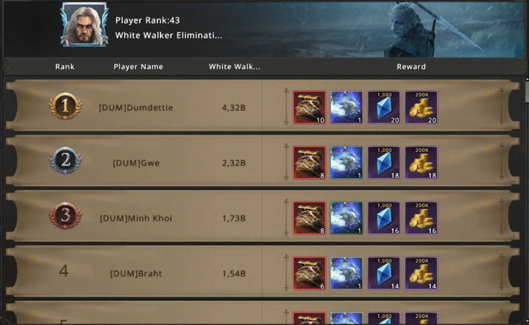 The Night King was slowly closing in on Winterfell, indicating that an attack would come soon. His bubble would drop, and the rewards all players in K114 would earn would depend on how quickly they could defeat the Night King's forces. Would these brave warriors manage to defeat the Night King in a short time, or would the resurrection powers possessed by the Night King pose significant challenges to the players in K114? Read on to find out what happened on the 4th day. On this day, Dumdettie continued to lead with the highest number of points earned for killing generals.