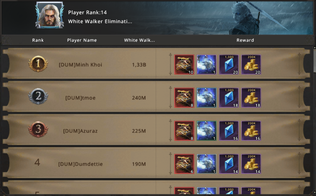 The Night King is approaching with his army of the undead. Will the brave warriors from K114, supported by commanders from King's Landing led by the valiant Daenerys, stop this monster from launching a bloody invasion? Can they prevent the Eternal Winter that looms with great force just beyond the Wall? Read on to discover what happened each day of this event, along with a description of the best player who earned the most points for defeating the Night King's forces.