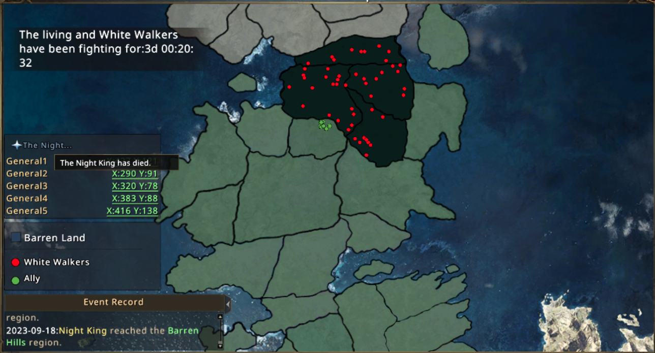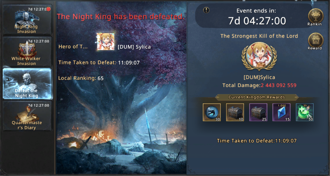Day 4: After taking control of the Barren Hills Region, unexpectedly, the Night King decided to declare war on all of Westeros. His bubble dropped, leaving him vulnerable to attacks. Brave warriors from K114 immediately decided to kill him. The most effective in this endeavor, and consequently killing the most of his soldiers, was Sylica from DUM. After several hours and numerous attacks on him, the Night King was defeated. The inhabitants of Westeros could now breathe a sigh of relief. His undead did not leave the lands, but without their master, they couldn't continue their bloody march deeper into Westeros. They were left only to fight against the commanders led by Daenerys in Winterfell.