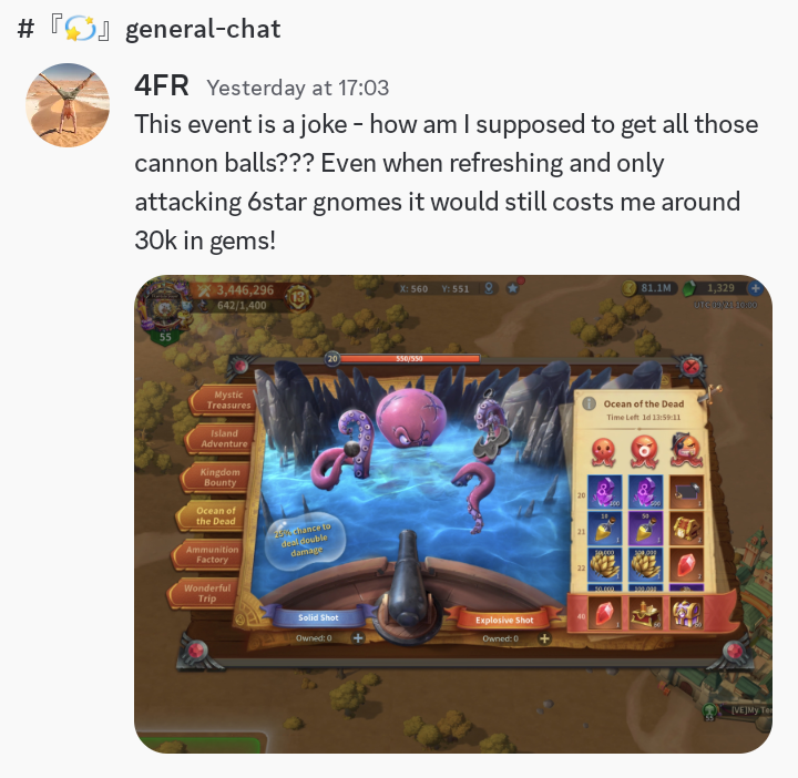 First and foremost, we will see what people says through Discord. Someone says he can't make it with 30,000. How is it possible and how to do this event efficiently? Someone say that the Pirate Festival will be at least 20,000 gems, but based on facts and data is it true? Let's take a closer look!