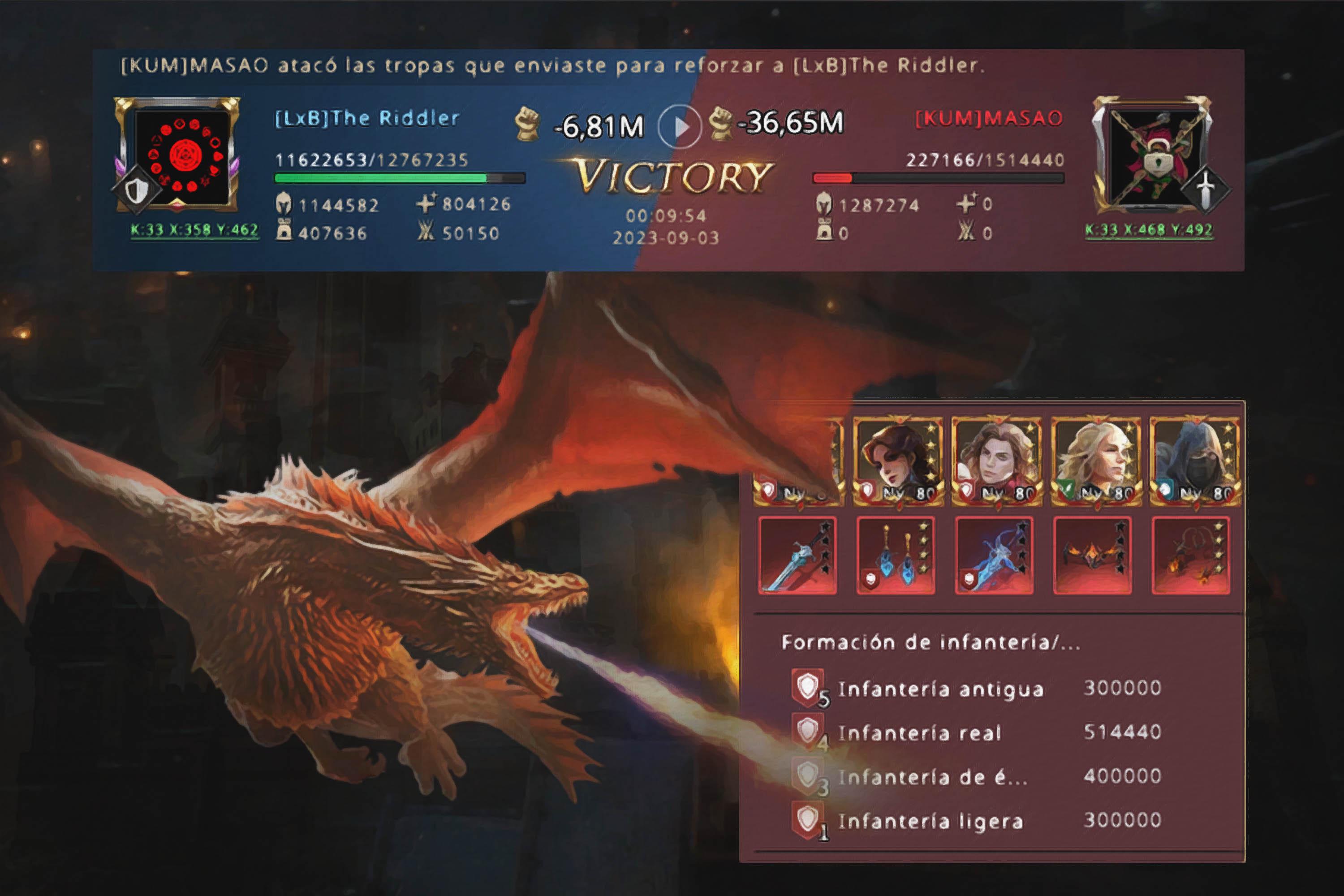 When the red-haired warrior was on the brink of the enemy, he was surprised and surrounded by a large army that, despite their numerical disadvantage, decided to fight. However, the allied dragons, which this time attacked from the open sky, left no chance for victory. Masao was captured, and his entire army lay scattered on the battlefield. The news of this defeat did not reach the other two major cities that were being occupied quickly, so Shinichi and Vangark took advantage of the element of surprise and won their respective battles. The rest of the enemy army retreated upon realizing that they had lost their Lord and were attacked on two other fronts.