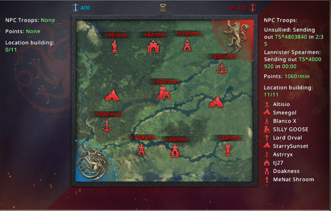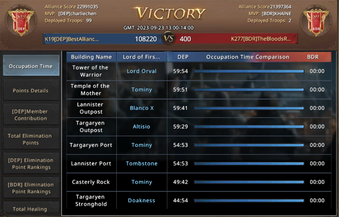 PART I - The first 15 minutes were a battle for buildings, but only by DEP players. Once again, these brave warriors decided to turn this boring final into a race to see who could capture the buildings first. The Mother's Temple was captured first by Tominy, the Warrior's Tower by Lord Orval, the Lannister Outpost by Blanco X, and the Targaryen Outpost by Altisio. Congratulations on winning these races. The first 15 minutes in the other matches also mainly belonged to DEP; their strength and speed often caused problems for their opponents. This makes DEP one of the fastest teams in this event; it's hard to find such a fast alliance. However, in a match without competition, it's difficult to showcase other strengths that DEP also possesses. Further into the match, DEP continued to dominate.