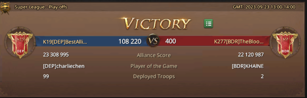 PART III - The final 15 minutes were a battle for mines, but again, without rivals. StarrySunset captured the Lannister Mine, and Smeegol secured the Targaryen Mine. With these victories, DEP won the final and secured another well-deserved victory. BDR took second place, and N30 took third. Congratulations to DEP and N30 for their fantastic match and outstanding final results. As for BDR, well, there's not much to say. The competition for mines was another advantage for DEP. Fighting for these valuable buildings, which amounted to a total of 28k points, showed DEP's determination to win until the very end. Their strength, endurance, and mining abilities combined resulted in a significant number of points for DEP, and not only in mines but also in the defense of other buildings. The entire season demonstrated that these assets together led DEP to well-deserved victories in every match. Congratulations to the new champions, their glory and strength will be known throughout Westeros!