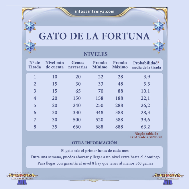 Les comparto la tabla de niveles del gato de la fortuna para que puedan planear sus invocaciones, información oficial de infosaintseiya.com