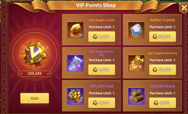 Once players get to VIP 15, they can access the VIP Points Shop. Each batch of 20 Holy Dragon Crystals cost 3,000 VIP Points. Players can trade up to 5 batches a day (100 Holy Crystals), totaling 15,000 VIP Points which is equivalent to $1,500 worth of packs that give VIP Points. Certain packs like the Eye of Chaos and Theia’s Roulette Ticket bundles do not give gems or VIP Points. These Dragon Crystals are one of the more expensive crystals one can purchase. Unfortunately for Shadow Dragon users, Shadow Dragon Crystals are not available for purchase in the VIP shop.
