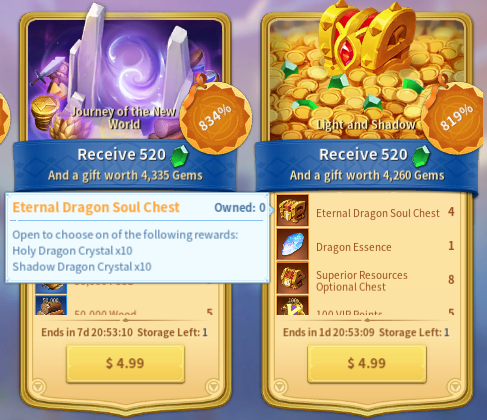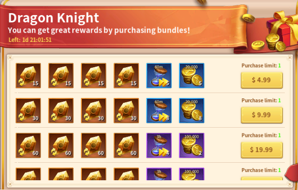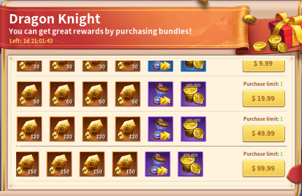 The more recently released Dragon Knight bundles are purchasable once a week. Players can get to 1,500 Holy or Shadow Dragon Crystals a week for $185. These bundles also include a few dozen hours’ worth of universal speedups and some gold.