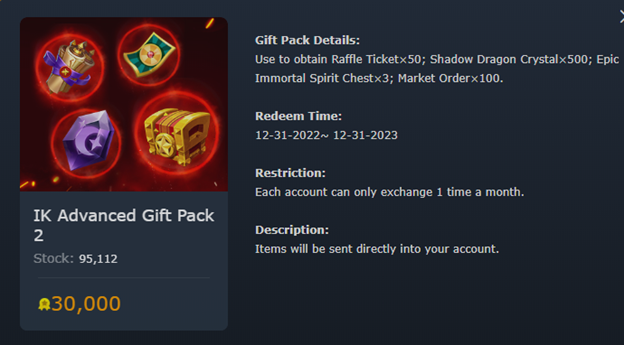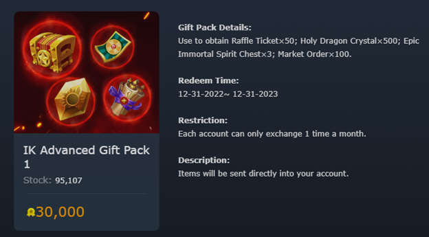 In the Points Giftpack section of the GT Arcade App, players can purchase the IK Advanced Gift Pack 1 and the IK Advanced Gift Pack 2 which gives 500 Holy Dragon Crystals and 500 Shadow Dragon Crystals, respectively. Both packs also contain 50 Raffle Tickets, three Epic Immortal Spirit Chests, and 100 Market Refresh Orders. Each of these packs can be purchased once a month for 30,000 GT Points each. These points can be earned by making purchases through the GT Arcade App. There are also daily tasks like viewing and liking forum posts, the Wheel Event, and Getamon mini-games (Monster & Monster and Monster Match) where you can earn GT Points.