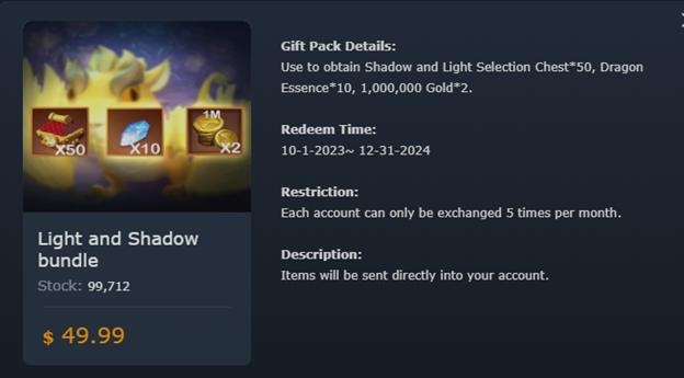 On the GT Arcade App, there are a couple of monthly packs and bundles players can purchase as well. The Light and Shadow bundle gives 50 Shadow and Light Selection Chests that allow players to select 10 Holy or Shadow Crystals each, totaling 500 crystals. It also gives 10 Dragon Essences and two million gold. These bundles are purchasable five times so players can get a total of 2,500 crystals, 50 Dragon Essences, and 10 million gold for $250 per month.